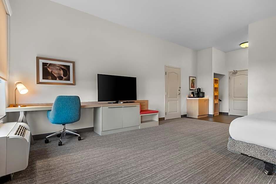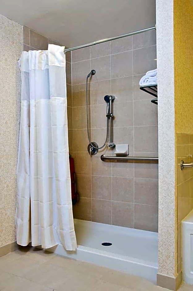 This mobility and hearing accessible standard room features one king-sized bed, and a roll-in shower. The room also has a visual alarm, and notification devices for the doorbell or door knock and incoming telephone calls. Roll-in shower with attached accessible seating, lowered vanity in bathroom, and lowered closet shelf. Enjoy our 36-inch HDTV, microwave, refrigerator and coffee/tea in your room. And for conducting business, our rooms ensure your productivity thanks to the spacious work desk, two telephones with dataport and voicemail and complimentary WiFi access and ergonomic chair. Any corresponding photo may not reflect the specific accessible room type or room feature.