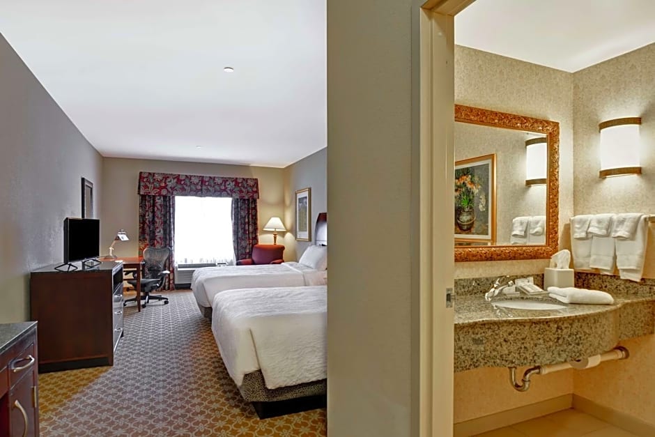 This mobility and hearing accessible whirlpool one bedroom suite features two queen-sized beds and an accessible tub. The room also has a visual alarm, and notification devices for the doorbell or door knock and incoming telephone calls. Grab bar in tub with attached accessible seating, lowered vanity in bathroom and lowered shelf in closet. Enjoy our 36-inch HDTV, microwave, refrigerator and coffee/tea in your room. Our rooms ensure productivity thanks to the work desk, two telephones with dataport and voicemail and complimentary WiFi access and ergonomic chair. This room includes a separate living area with a full-sized sofa bed, coffee table and TV. Any corresponding photo may not reflect the specific accessible room type or room feature.